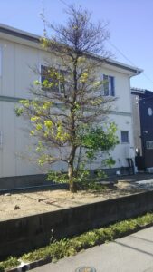 お庭の壁の際に植えていた植木を伐根いたしました。
