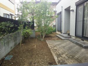 お庭に生い茂った雑草を刈り、整地、敷砂利いたしました。